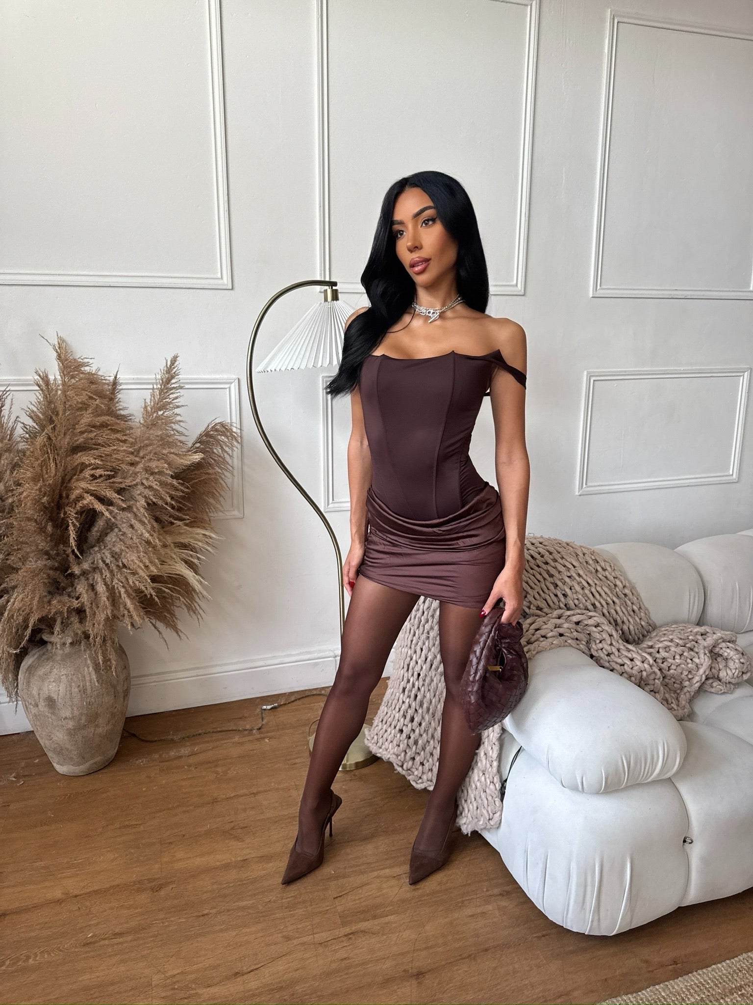Introducing the “Amélie Dress” in Mocha Brown – a timeless statement piece that blends structure with allure.
